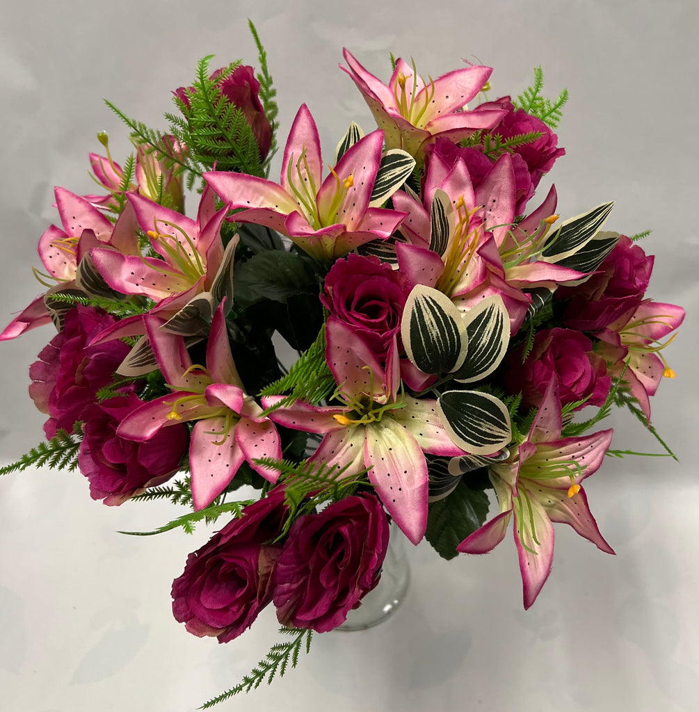 Artificial rose and lily bush with ferns and variegated greenery