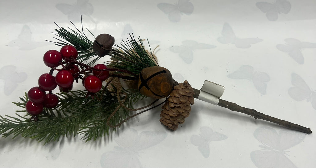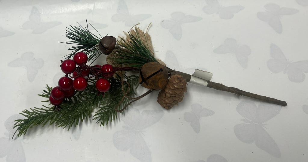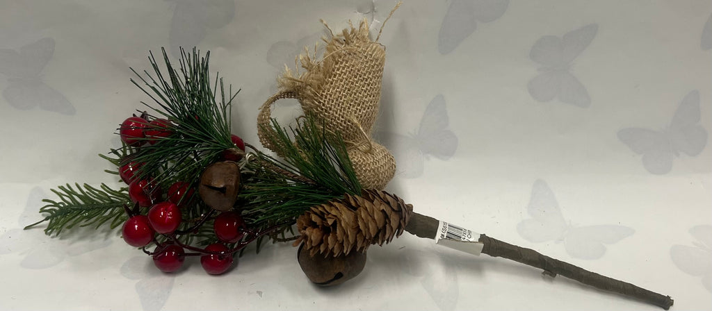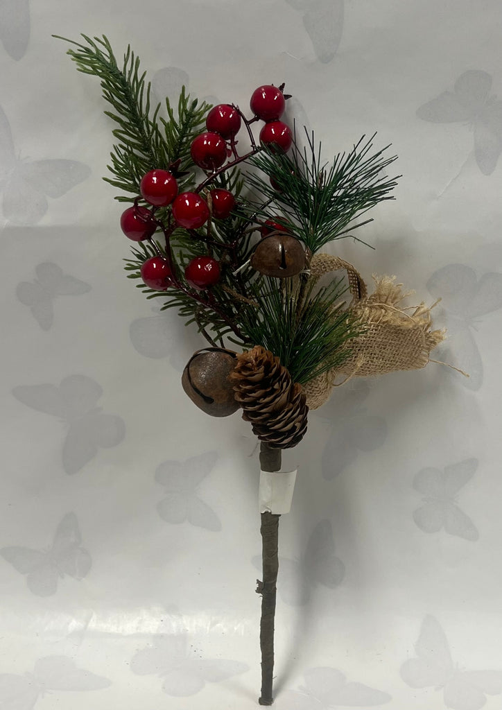 Artificial winter greens with pine cone, red berries, burlap and bells