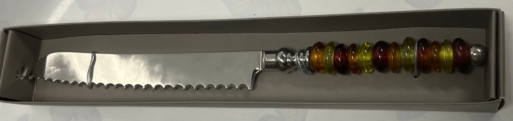 Serrated metal cake knife with glass handle