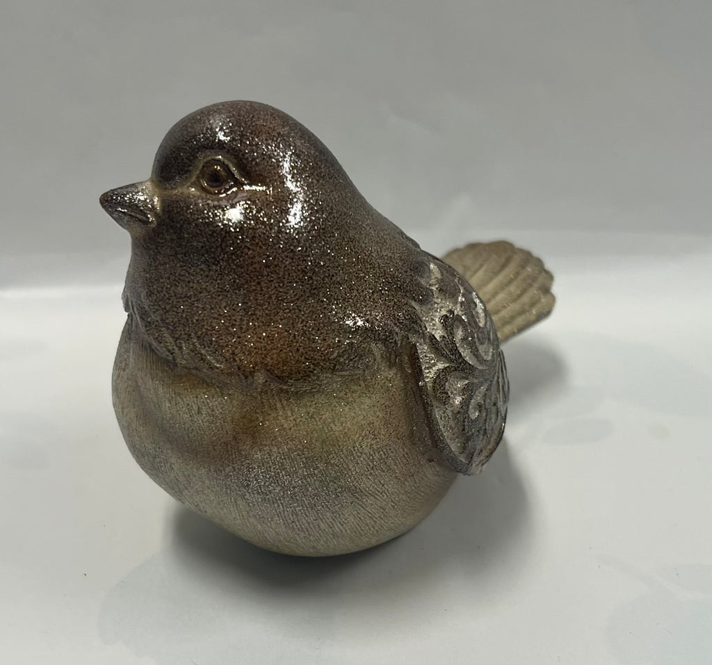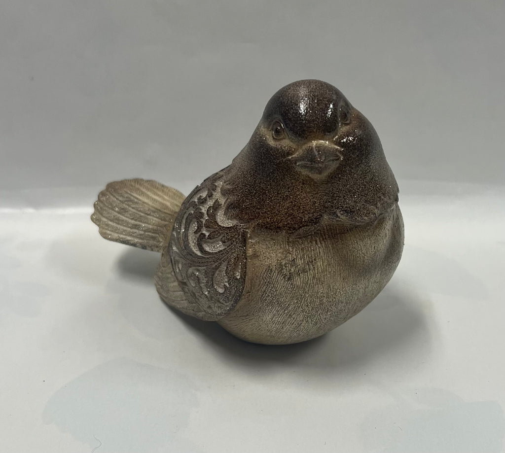 Brown/ taupe resin bird figurine with carved detailing on wings and glitter