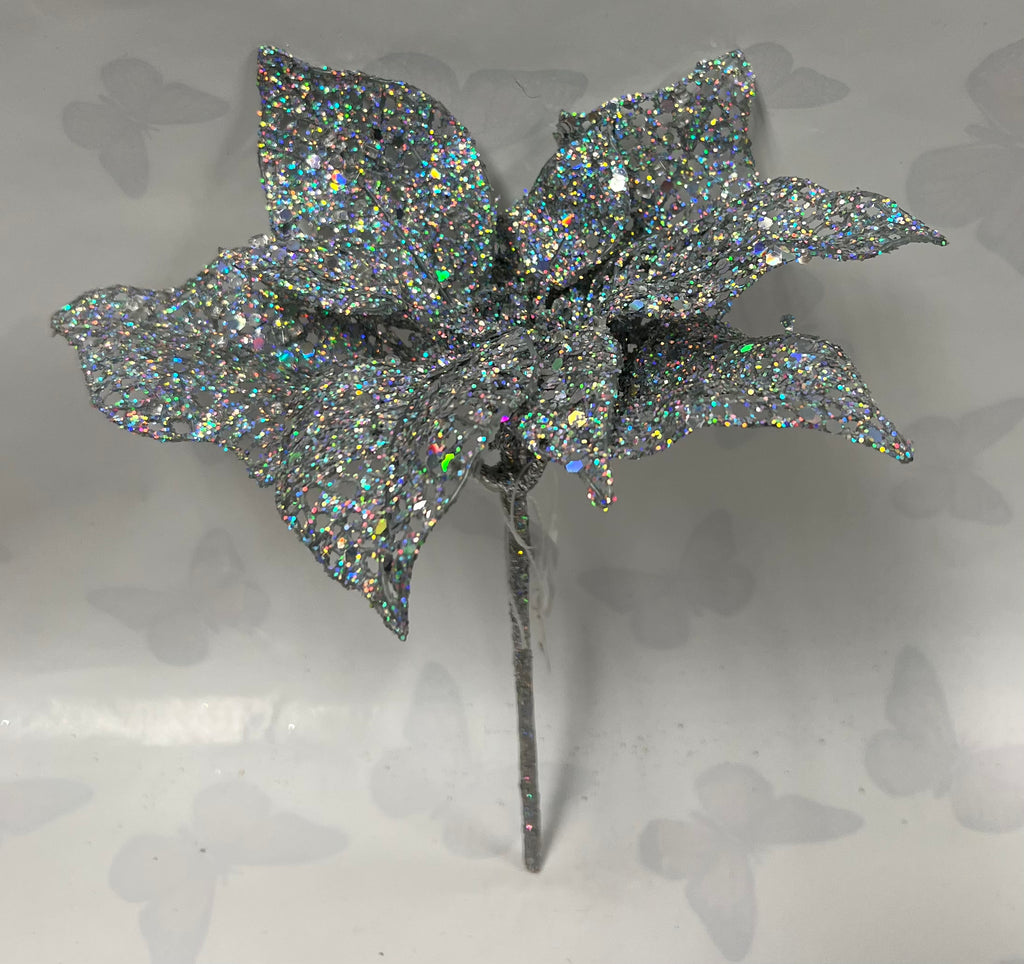 Silver poinsettia single stem pick with silver and iridescent glitter