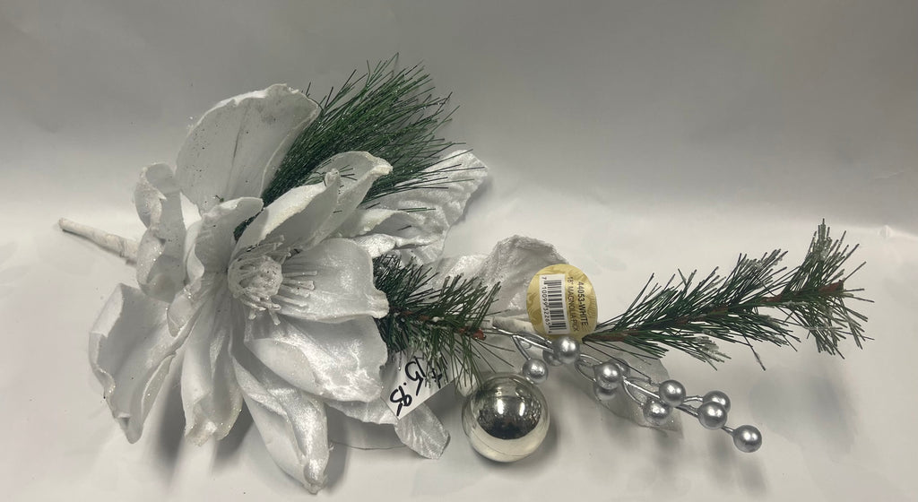 Artificial white coloured magnolia flower with winter greens, berries and silver ball ornament