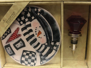 Gift set includes 6-1/4" round wine/ trivet and bottle stopper